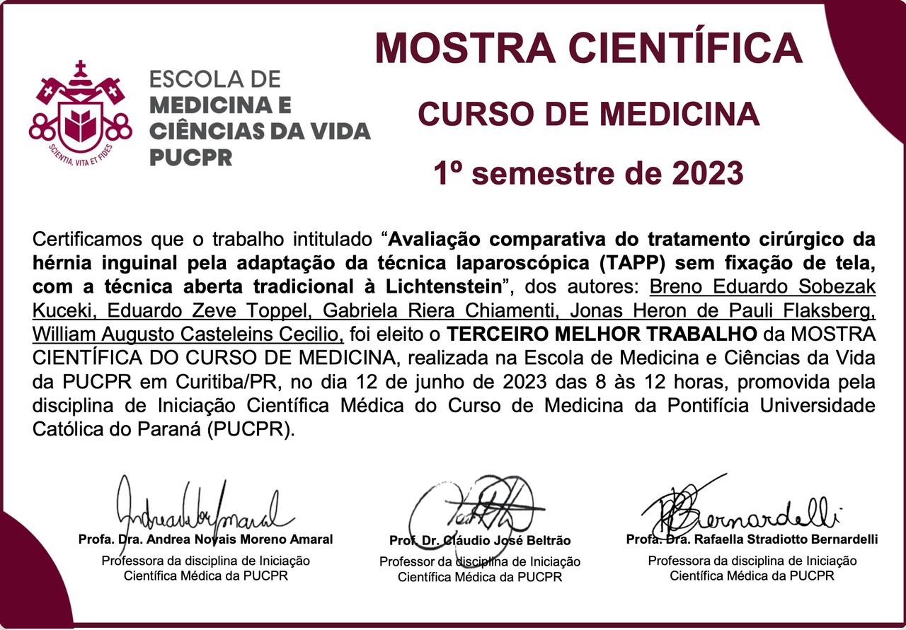 - 3o Melhor Trabalho da MOSTRA CIENTÍFICA da Escola de Medicina e Ciências da Vida da PUCPR em 2023